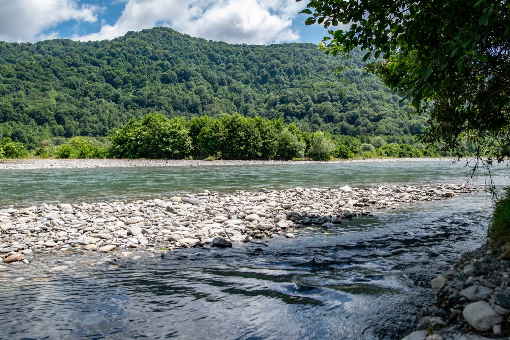 Берег покрыт галькой. Климат от Анапы до Новороссийска более влажный, а побережье покрыто лесом. От Новороссийска до Туапсе горы то подходят вплотную к морю, то расступаются, образуя долины. Здесь много уютных, красивых бухточек. Самые крупные из них расположены у Новороссийска и Геленджика. Пляжи каменистые и галечные, иногда песчаные. Климат средиземноморский. Лето сухое и жаркое, зима влажная. Растительность более разнообразная. Лесистые горы покрыты дубом, грабом, по берегу моря встречается можжевельник, крымская и пицундская сосна (особенно в районе Джанхота). От Туапсе до Адлера берег моря защищён Кавказским хребтом с высотой до 3000 м. Благодаря этому здесь не дуют холодные ветра и господствует субтропический климат. Дожди бывают и летом, но они скоротечны. Растительность, кроме дуба, граба, бука, каштана и других пород, представлена вечнозелёными растениями: тис, самшит, лавровишня, лианы. В курортных посёлках растут пальмы, эвкалипты, кипарисы и другие экзотические растения.